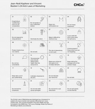 According to The Luxury Strategy, Arnault mastered what Kapferer and Bastien call the “24 anti-laws of marketing”, rules that invert conventional marketing logic. These include: